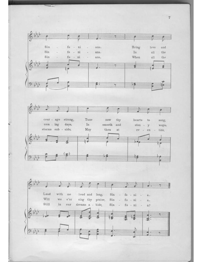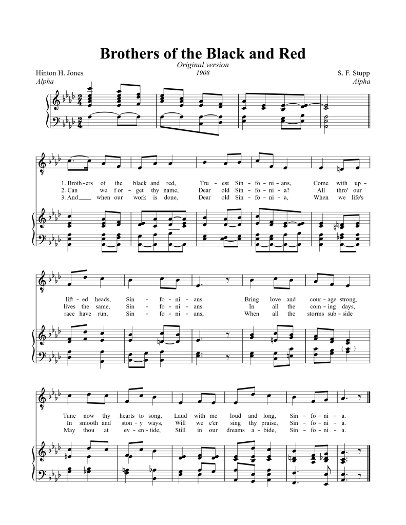 | Lyrics | 1. Brothers of the black and red, truest Sinfonians, Come with uplifted heads, Sinfonians. Bring love and courage strong, Tune now thy hearts to song, Laud with me lous and long, Sinfonia. 2. Can we forget thy name, Dear old Sinfonia? All thro’ our lives the same, Sinfonians. In all the coming days, In smooth and stony ways, Will we e’er sing thy praise, Sinfonia. 3. And when our work is done, Dear old Sinfonia, When we life’s race have run, Sinfonians, When all the storms subside, May thou at eventide, Still in our dreams abide, Sinfonia. |